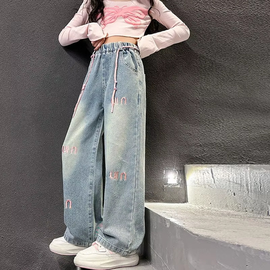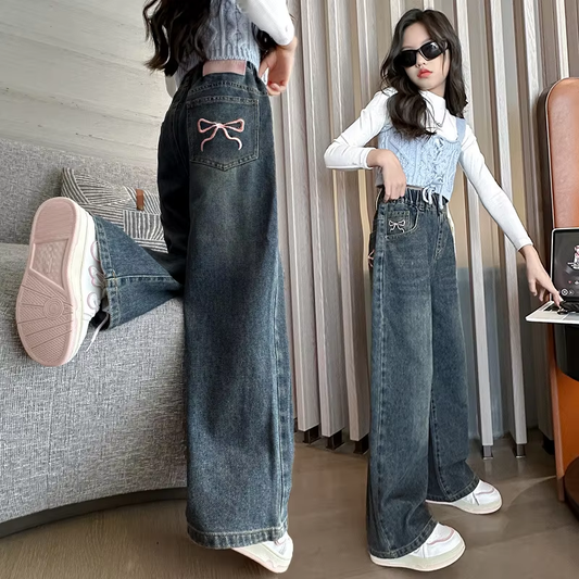 Džíny s výšivkou na dívčí kapesní mašli – trendy široké džínové kalhoty pro dospívající, volné kalhoty na jaro a podzim (4–14 let)