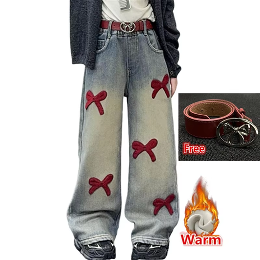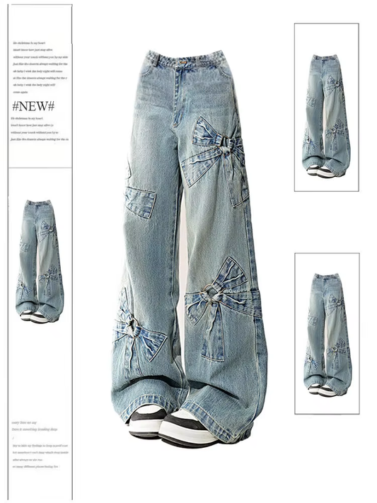 Dámské modré džíny s mašlí – Harajuku Y2K Estetické, pytlovité vintage džínové kalhoty, oversized styl 2000