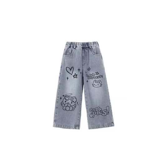 Kitty Y2K Wide Leg Jeans – Vintage streetwear džínové kalhoty, rovné kalhoty inspirované anime pro ženy